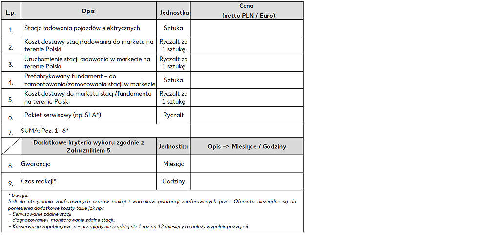 2. Niniejszym składamy ofertę na dostawę stacji wraz z montażem i uruchomieniem stacji ładowania pojazdów elektrycznych obiektów Kaufland w zakresie wykonania na parkingu stacji ładowania pojazdów elektrycznych wraz z towarzyszącą infrastrukturą techniczną zgodnie z przedmiotem zlecenia.