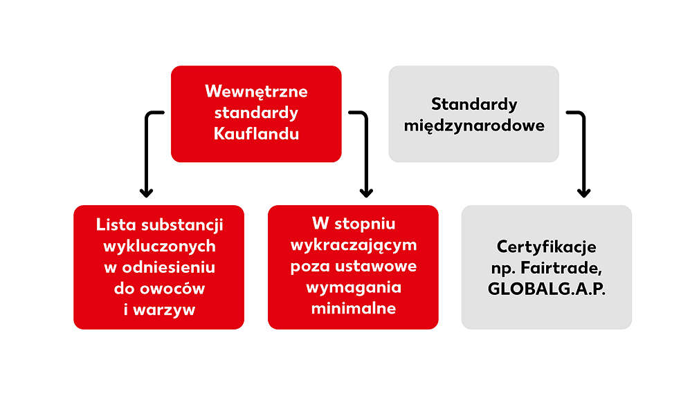 Na tych podstawach opiera się system zarządzania pestycydami w Kauflandzie. Standardy Kauflandu zostały określone w dokumentach „Specyfikacje firmy Kaufland“ oraz „Lista substancji wykluczonych“ .